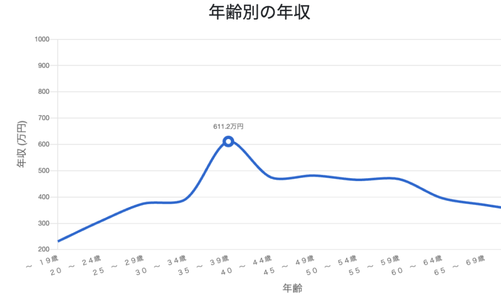 30代後半から40代後半にかけて、最も年収が高く、およそ600万円に到達します。40代でピークに達します。